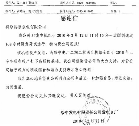 日前,綏中發(fā)電有限責(zé)任公司發(fā)電B廠發(fā)來感謝信,通報(bào)了我公司供貨的2000VZNM型立式循環(huán)水泵順利通過168小時(shí)滿負(fù)荷試運(yùn)行, 順利發(fā)電。綏中發(fā)電有限責(zé)任公司發(fā)電B廠,為2X1000MW超